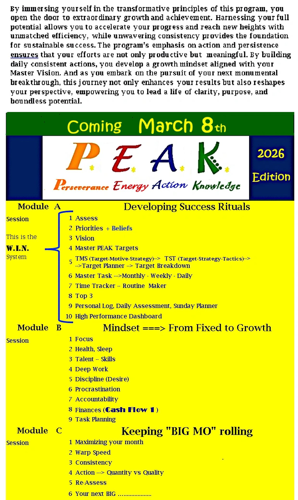 This In-Depth program will guide you, Step by Step, What-To-Do and How-To-Do-It --- starting Right Now. As the saying goes -- the best time to start was a year ago, the 2nd best time is NOW. P.E.A.K. is the single most powerful tool I can give you to succeed at anything you're trying to achieve in life - - do it quickly and -- oh yea -- have a fun time doing it.